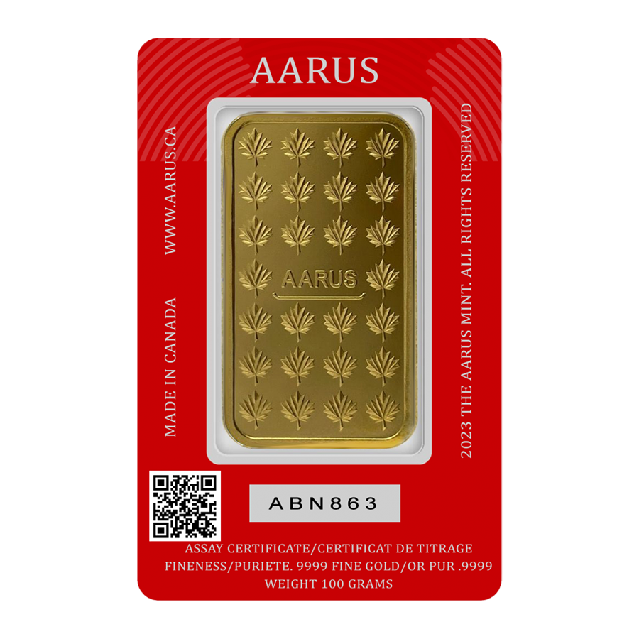 The 100 grams Aarus gold bar is an extraordinary piece of precious metal art that exudes quality and elegance. Made in Canada, this gold bar is crafted with the finest LBMA-approved refiner metals, ensuring its purity and value. With a purity level of 9999 fine, this gold bar is among the purest and highest quality gold products available on the market today. Its stunning design features the Aarus logo, weight, and purity level on the front of the bar, while the back displays the Aarus.