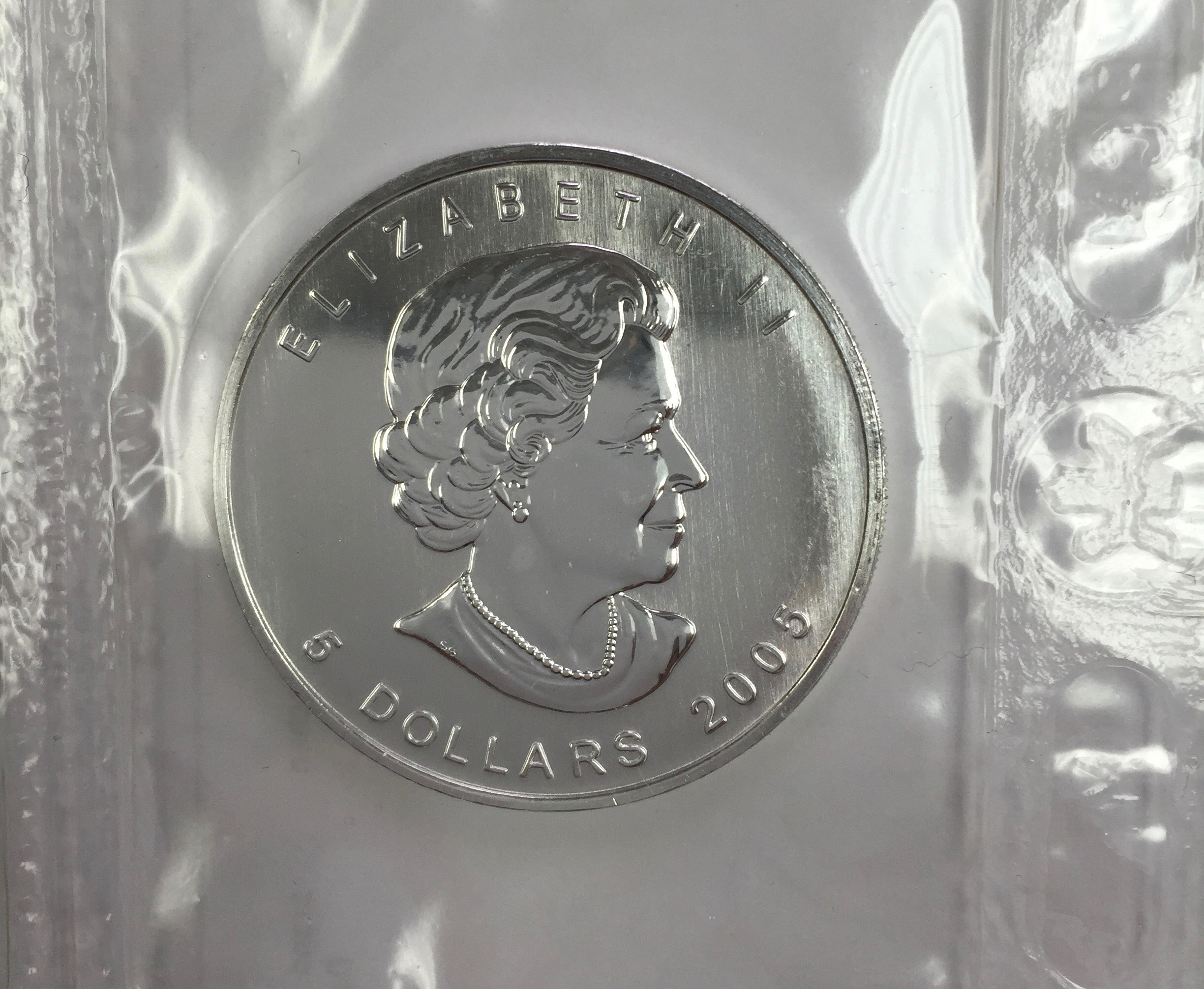 The Silver Maple Leaf coins are considered some of the most beautiful Silver coins in the world. Canadian Silver Maple Leaf is the flagship silver bullion coin produced each year by the Royal Canadian Mint. The primary image on the 2005 coin features an intricately detailed maple leaf, with every detail easily visible. On the opposite side of the coin, the effigy of Her Majesty Queen Elizabeth II is again featured as it is on numerous other coins designed by the mint each year.
