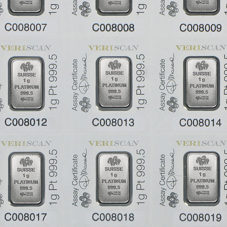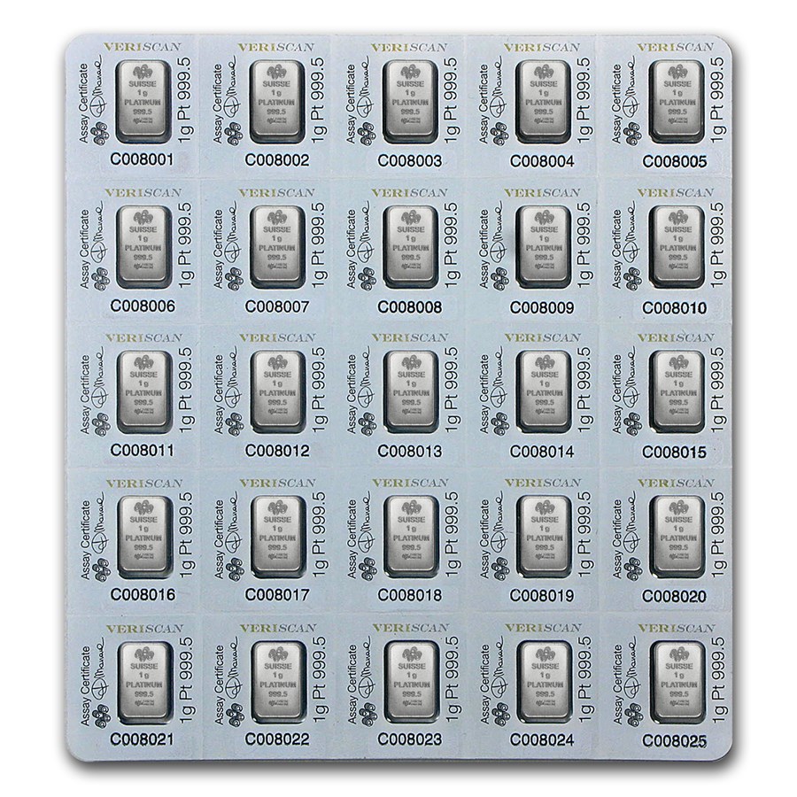 - Contains 25x 1 gram bars of .9995 fine Platinum (0.80375 oz).
